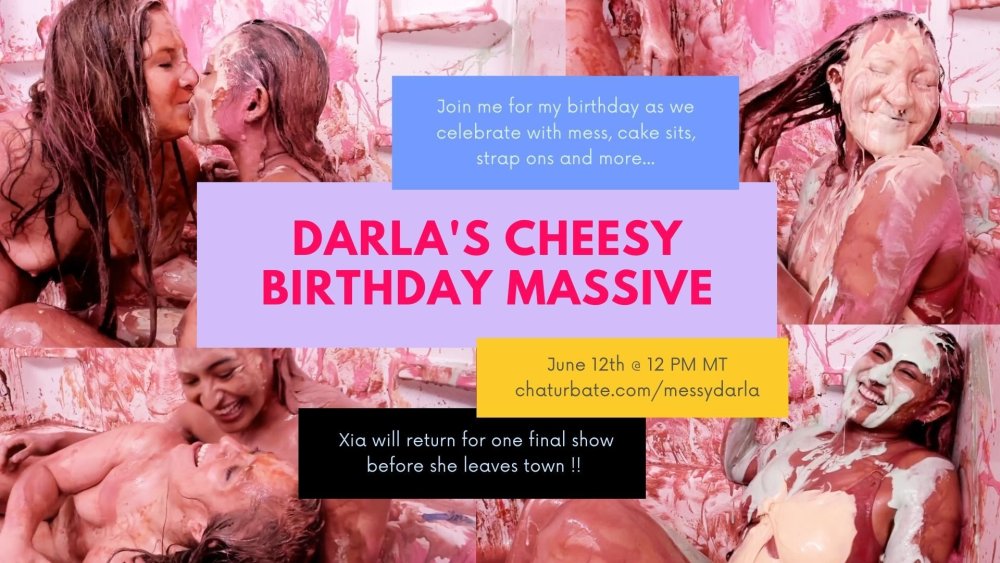 Hi all !! It's officially my birthday on Friday and we'll be celebrating live on Chaturbate with cake sits, strap ons, messy dares, the gunge tank, and TONS of mess of course :loveeyes: show starts at 12:30 PM MT. Cheese is my favorite food, so I will have some specialty food items on the menu for this show (cream cheese, sour cream, mac & cheese, etc.) Our special guest Miss Xia will also be joining us for one last birthday trashing before she leaves town <33
